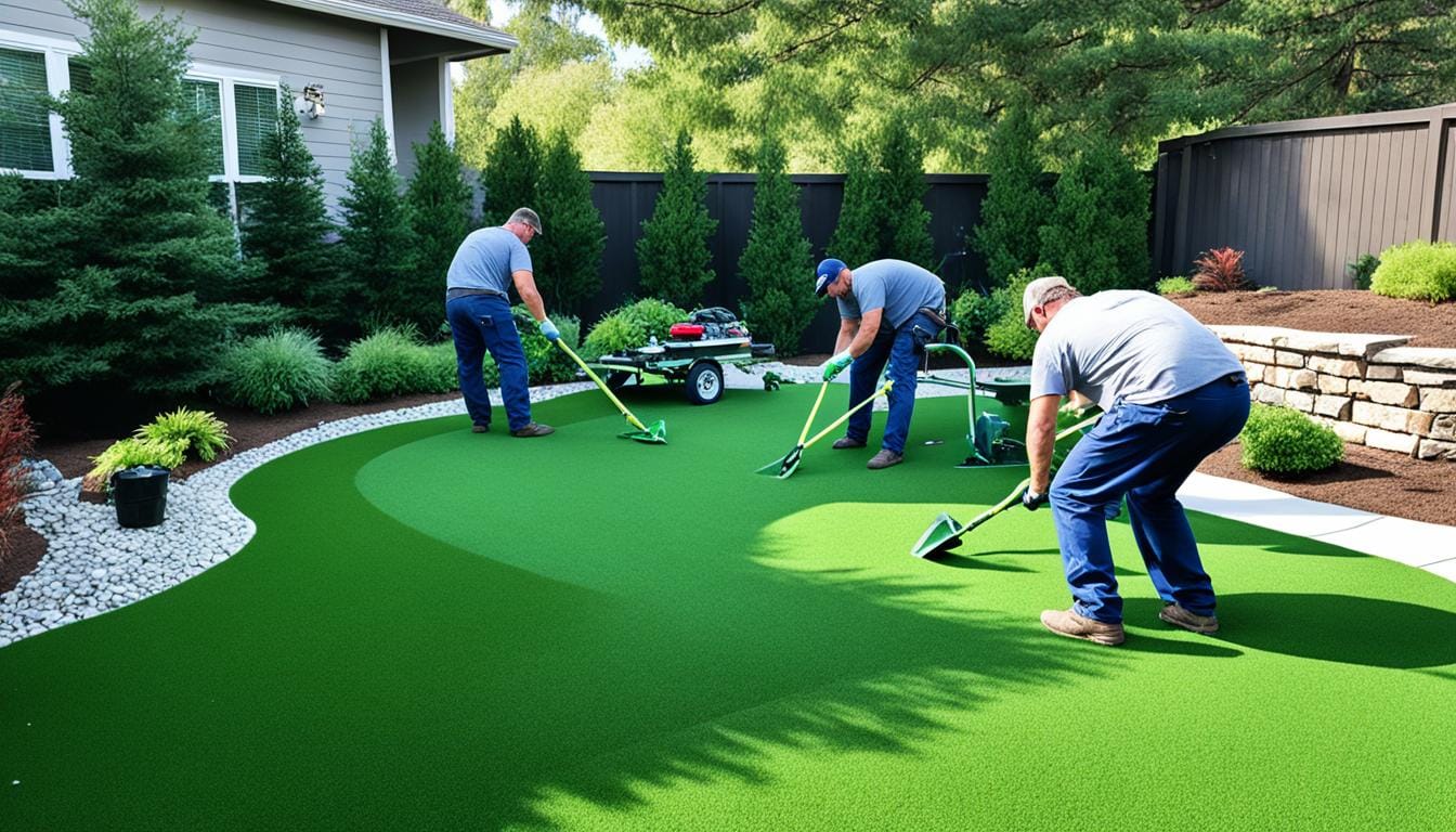 Artificial grass installers spend a lot of time checking the yard, measuring it, and leveling it for a perfect fit9. They make drainage plans that fit your lawn’s unique needs, ensuring the water is managed well9. Before putting the turf down, it’s important to let it sit in the sun for 30-60 minutes to expand and settle10.