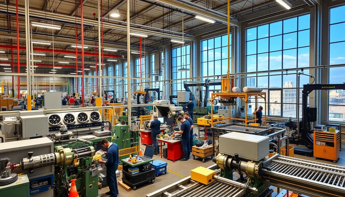 Manufacturing touches many areas, from tech to food. It added $2.1 trillion to GDP in 2013, making up 12.5 percent of U.S. GDP4. The industry is diverse, contributing 10.1% of U.S. economic output through various manufacturing activities3. This shows its big role in economic growth and industrial impact.