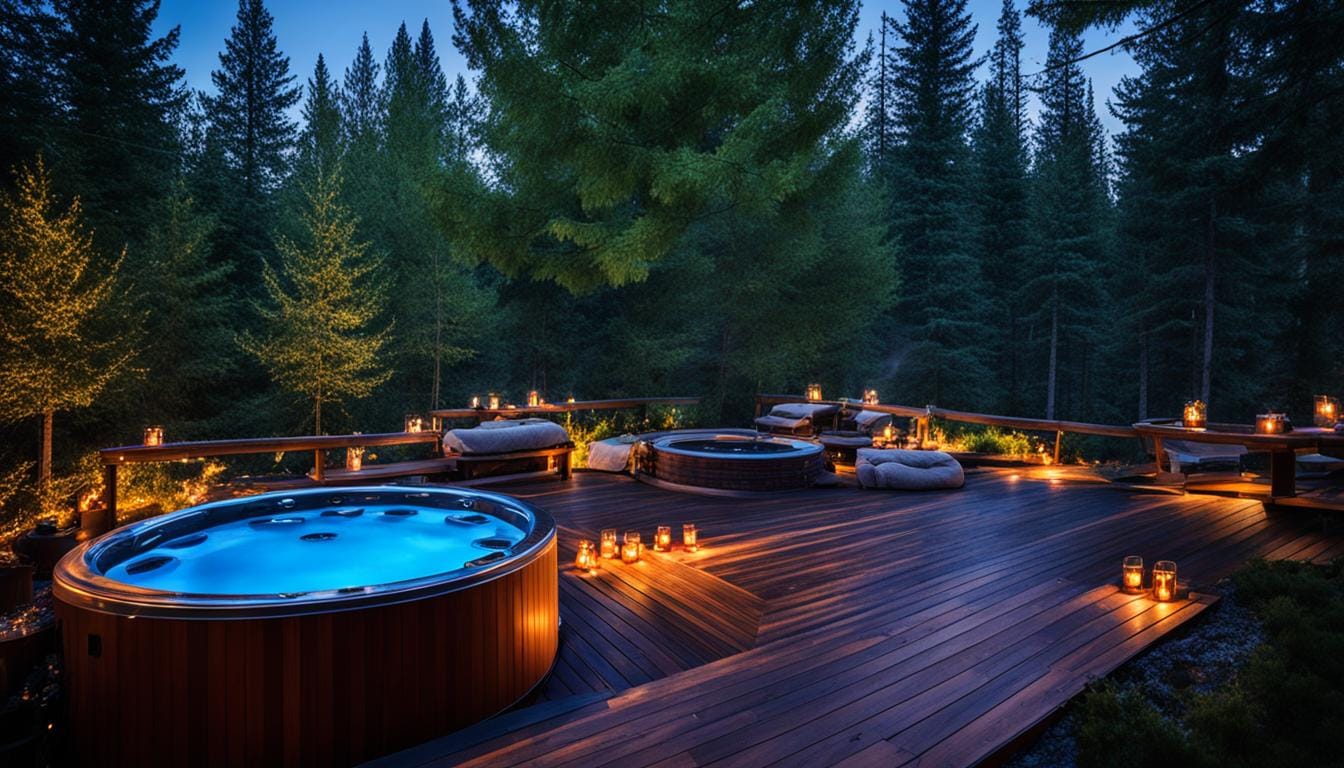 Custom wooden hot tubs are another great choice. They come from materials like Alaskan Yellow Cedar and Oak6. These tubs are perfect for coastal or wilderness themes, blending well with the environment6.